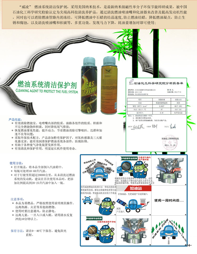 "Weiling"Cleaning agent to protect the fuel system the U.S. nano-technology, nano-magnetic single-molecule latest environmentally friendly energy research, scientific tests by China Petroleum & Chemical identified as cutting-edge high-tech cleaning maintenance products.by cleaning fuel injectors and carburetor to improve and increase engine performance , but also can eliminate the fuel line freeze. Can reduce the rate of fuel in the crystallization of paraffin, wax to prevent fuel and reduce fuel freezing point, to prevent rust and corrosion, and clean fuel injectors and carbon deposits, etc., multiple effects. When horsepower decreased and fuel consumption increased, then can be used.