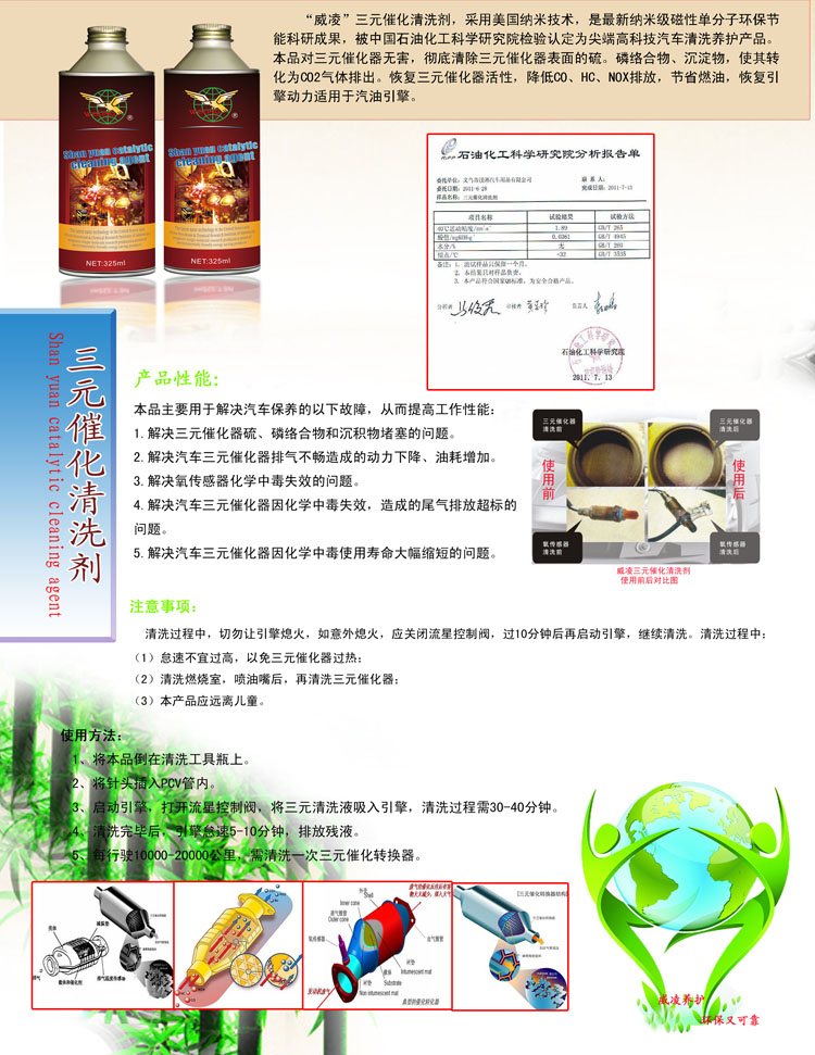 "Weiling" three kind catalytic cleaning agent, the U.S. nanotechnology, nano-magnetic single-molecule latest environmentally friendly energy research, scientific tests by China Petroleum & Chemical identified as cutting-edge high-tech cleaning maintenance products. This product is safe for catalytic converters, catalytic elimination of sulfur in the surface. Complex phosphorus, sediment, to make it into CO2 gas emissions.  Restore activity catalytic converters to reduce CO, HC, NOX emissions, save fuel, the engine power to restore, for gasoline engines.